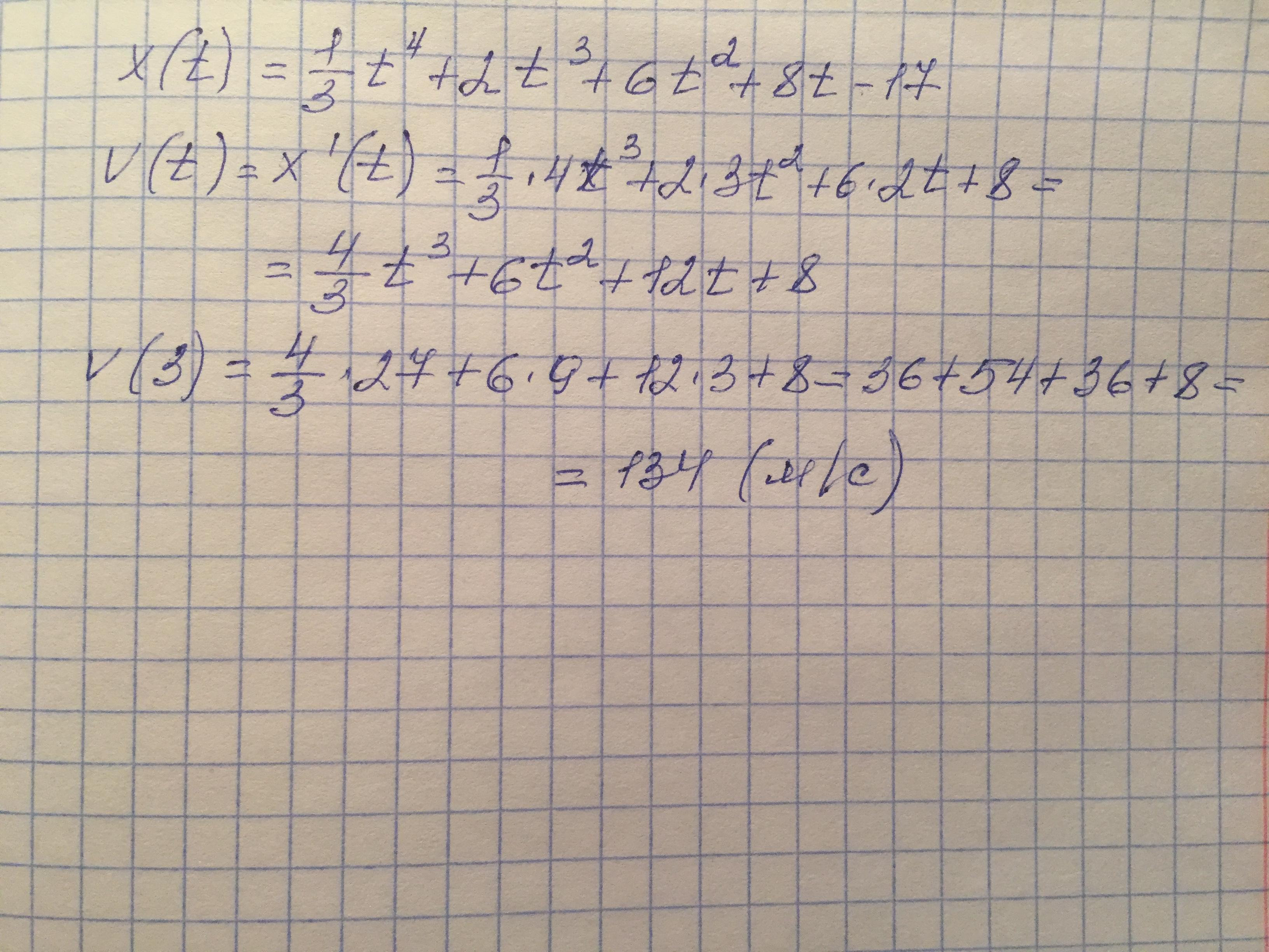 Материальная точка движется прямолинейно по закону x(t)= 1/3t^4+2t^3+6t^2+8t-17 найдите ее скорость (в м/с) в момент времени t=3с