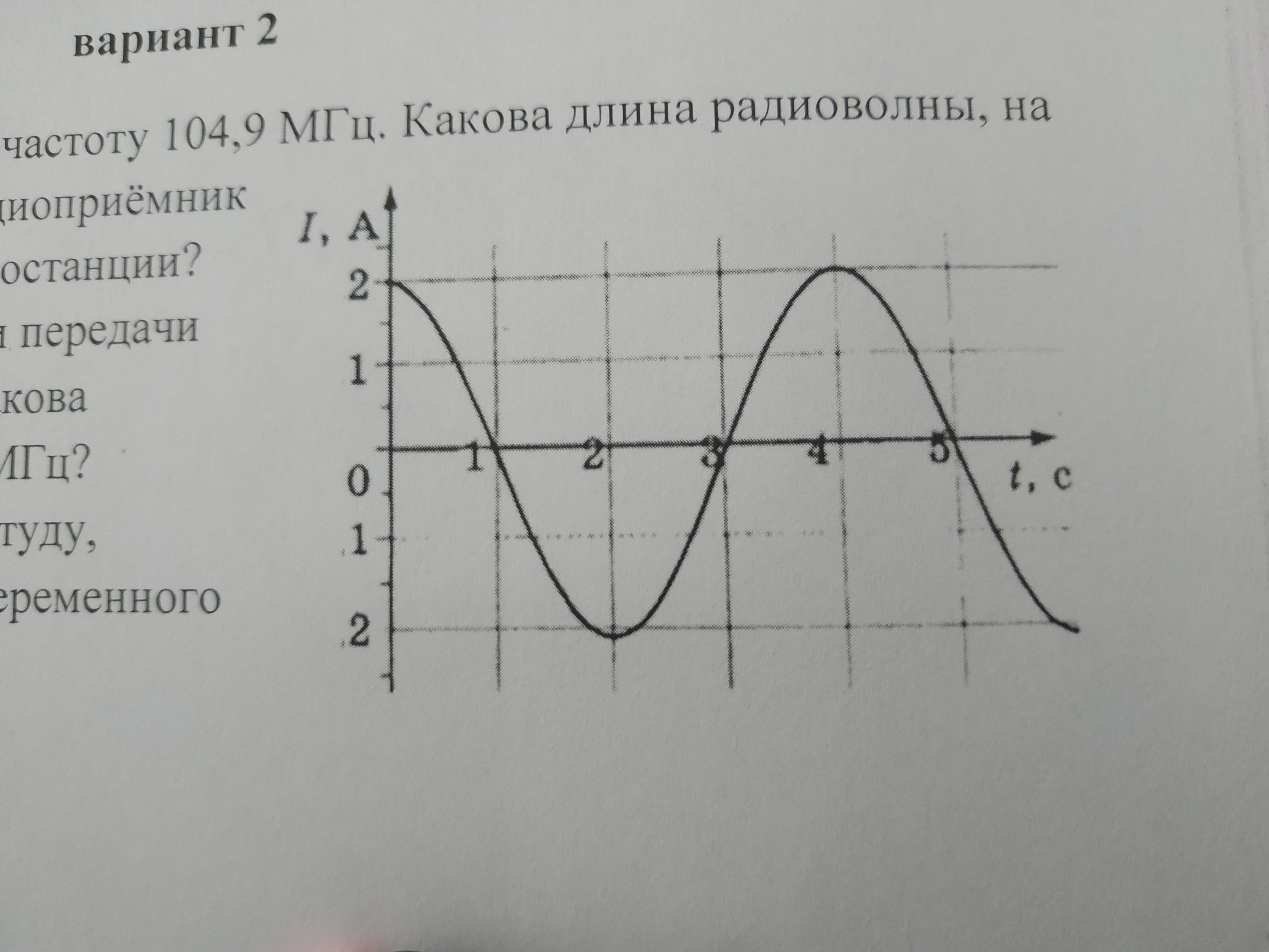 Ответ: амплитуда 2А, период 5-1=4 с, частота 1/4=0,25 Гц.