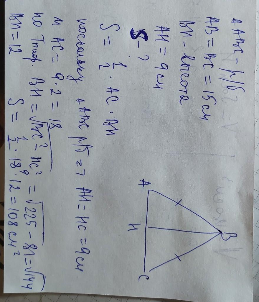 В равнобедренном треугольнике боковые стороны равны 15 см. BH-высота , AH=9 см. Найти площадь треугольника?