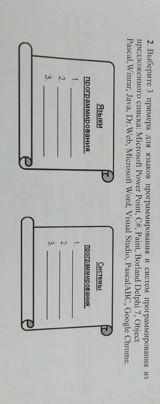 2. Выберите 3 примера для языков программирования и систем программирования из