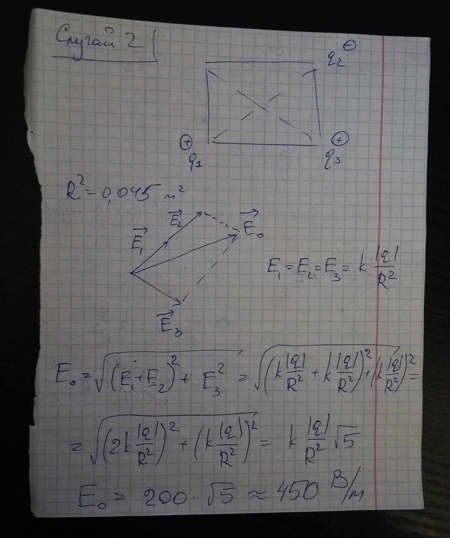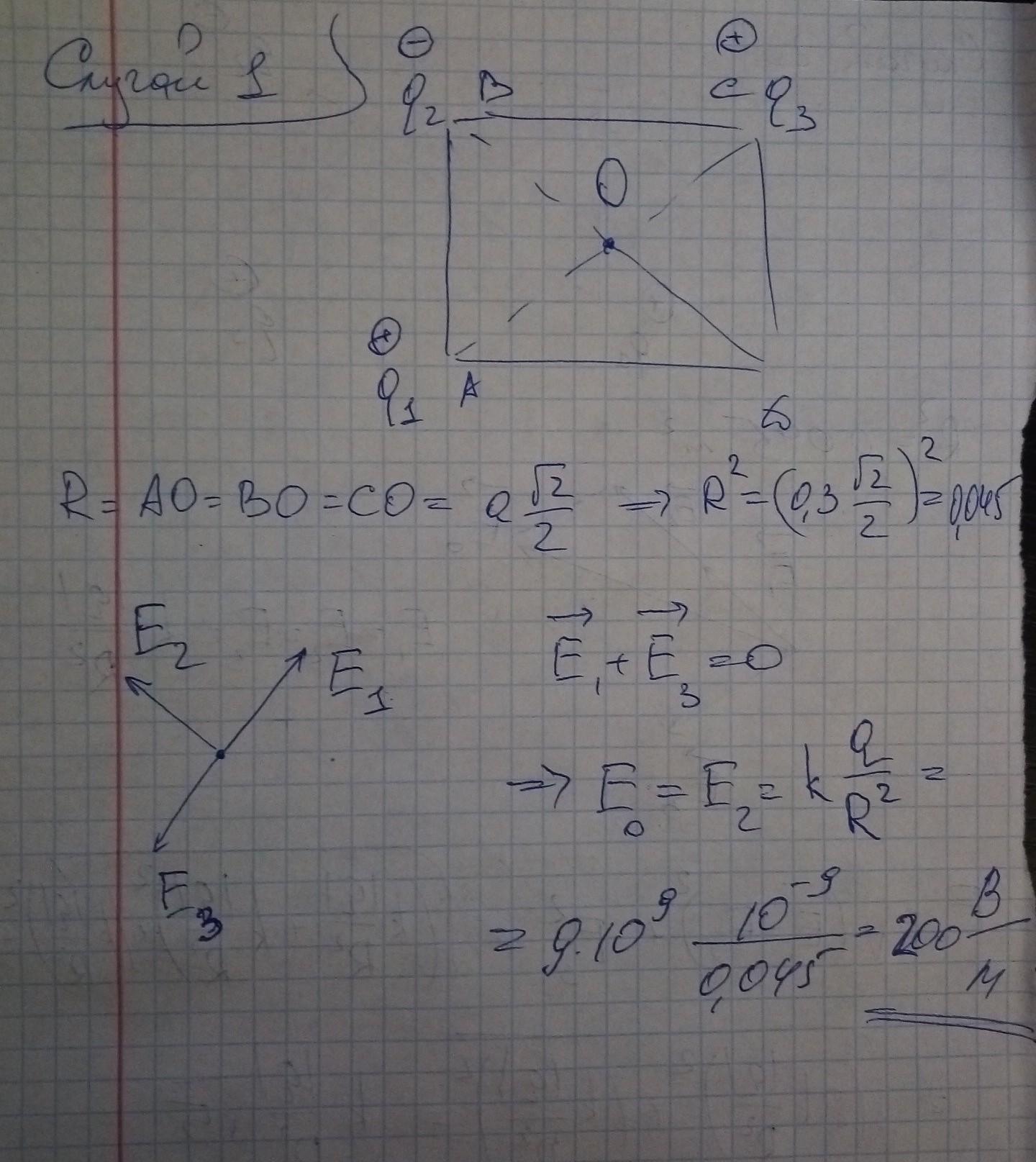 В вершинах квадрата со стороной 30 см. находятся точечные заряды: q1 = q3 = 1 нКл, q2 = -1 нКл. Найти напряженность электрического поля в центре квадрата.