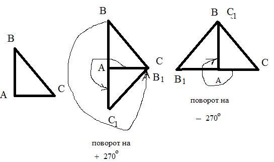 Нарисуй равнобедренный прямоугольный треугольник ABC и выполни поворот треугольника вокруг вершины прямого угла A на угол −270°.