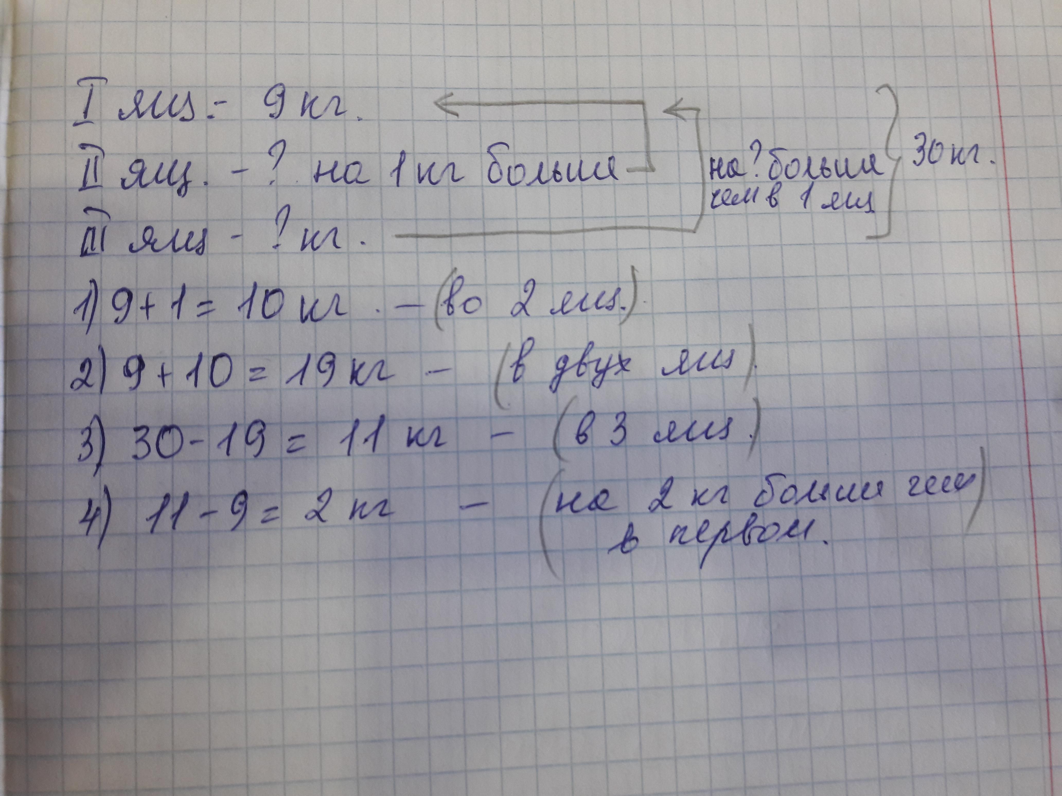 В трёх ящиках 30 кг яблок.В первом-9 кг яблок,во втором-на 1 кг больше.Сколько яблок а третьем ящике?На сколько килограммов яблок в третьем ящике больше,чем в первом?Помогите пожалуйста!!!!