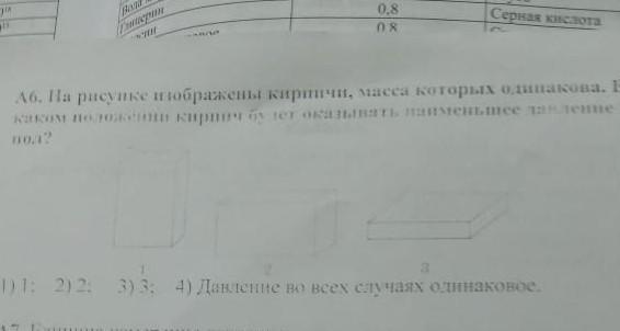 На рисунке изображены кирпичи масса которых одинакова.В каком положении кирпич будет оказывать наименьшее давление на пол?(10балов)