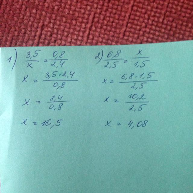 1) 3,5 : х = 0,8 : 2,4; 2) 6,8 : 2,5 = x: 1,5.
