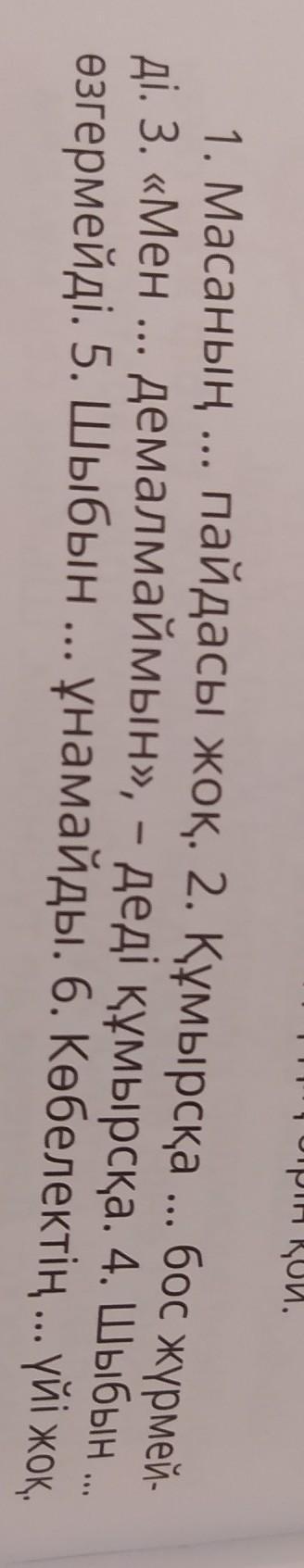 Масаның ешқандай пайдасы жоқ. Құмырсқа ешқашан бос жүрмейді. Мен ешқашан демалмаймын ,- деді құмырсқа. Шыбын- ешбір өзгермейді. Шыбын ешкімге ұнамайды. Көбелектің ешқандай үйі жоқ.