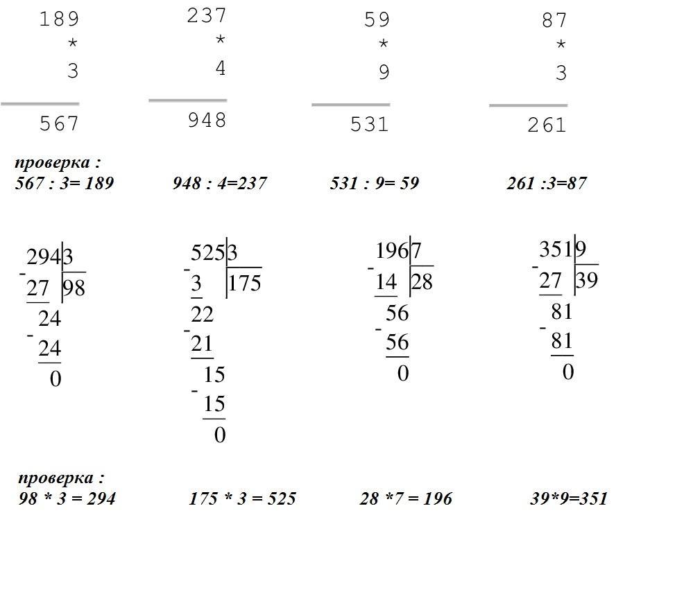 Люди помогите вот так Вычисли столбиком. Выполни проверку. 189 *3.237*4.59*9.87*3. 294:3. 525:3. 196:7. 351:9