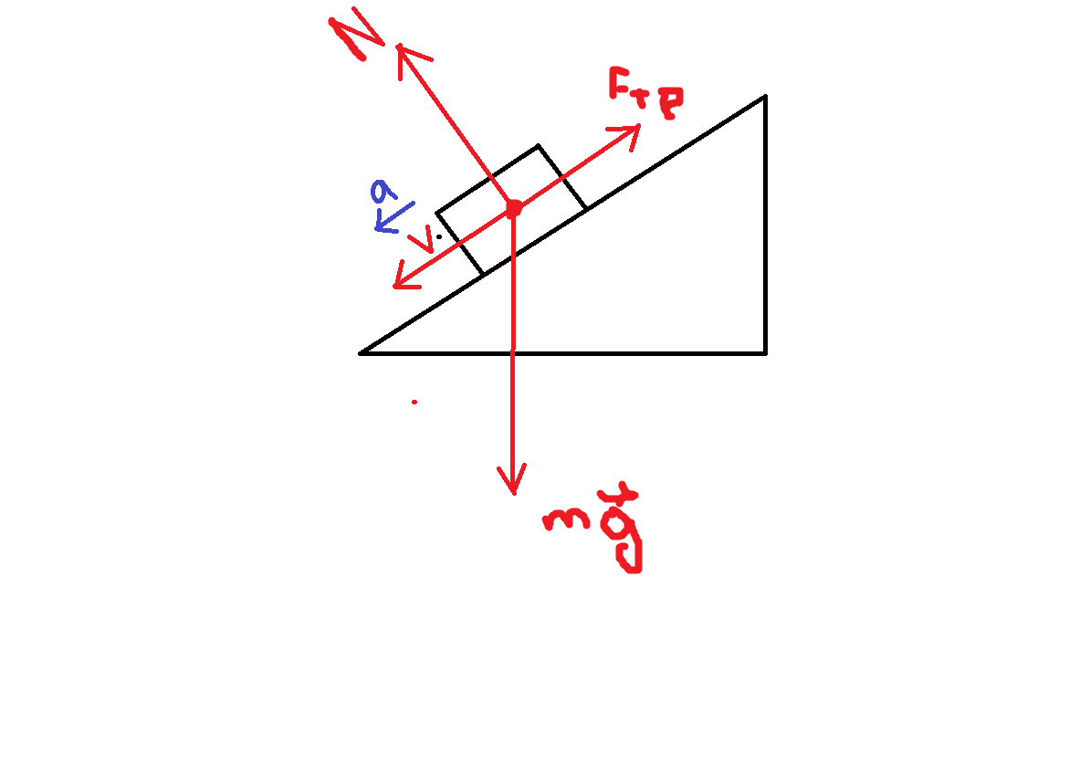 Тело соскальзывает вниз по наклонной плоскости. Нарисуйте вектора скорости тела, ускорения движения и равнодействующей всех сил, действующих на тело в центре наклонной плоскости.
