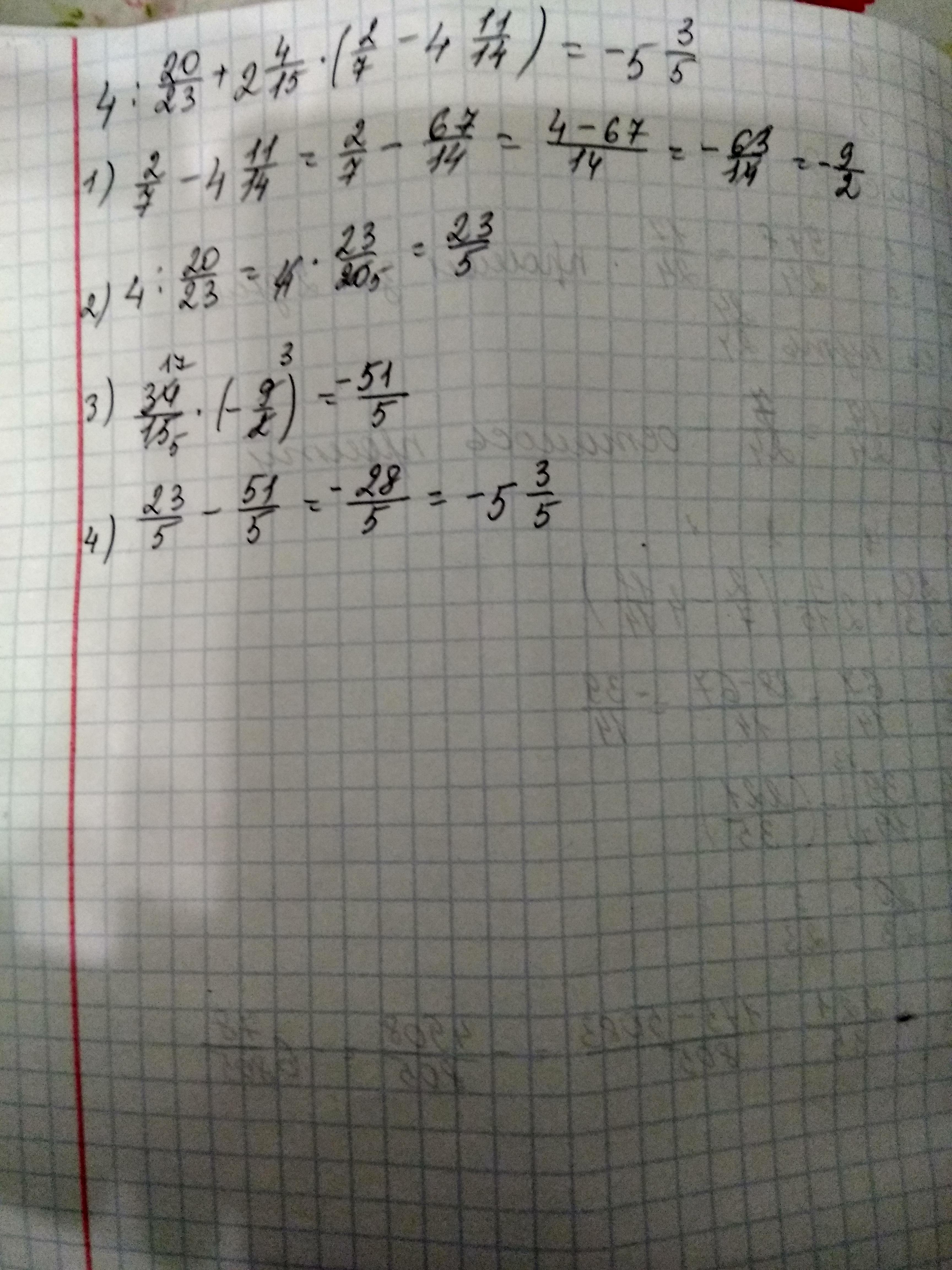 4 целых 20 / 23 + 2 целых 4/ 15 x 2/7 - 4 целых 11/14