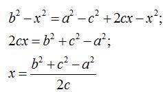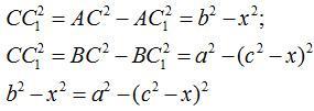 Проведем высоту CC1 и обозначим х длину отрезка АС1. Тогда ВС1=с-х. По теореме Пифагора получаем (фото 2):