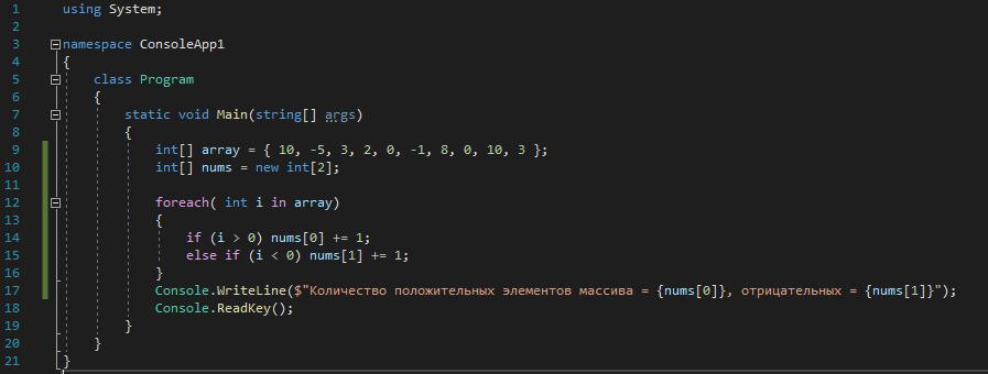 Console.WriteLine($"Количество положительных элементов массива = {nums[0]}, отрицательных = {nums[1]}");
