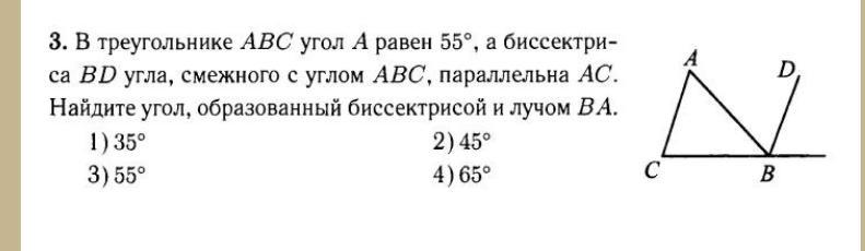 Все легко! Ответ 3) 55°, так как угол САВ = углу ABD как накрест лежащие углы