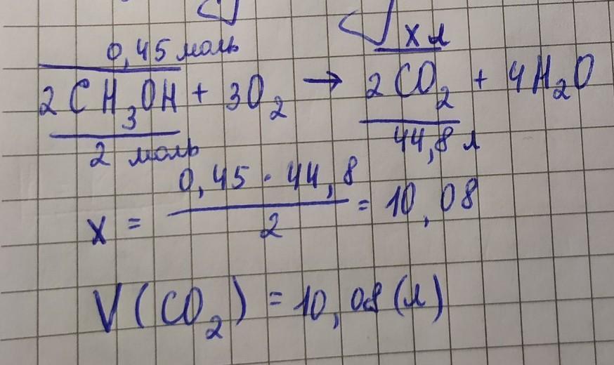 Будьласка терміново треба...обчисліть обєм вуглекислого газу (н.у),що утвориться внаслідок спалювання 0,45 моль метанолу