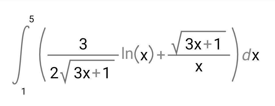 intlimits^5_1, Big(dfrac{3}{2sqrt{3x+1}}cdot lnx+dfrac{sqrt{3x+1}}{x}Big), dx=intlimits^5_1, dfrac{3cdot lnx}{2sqrt{3x+1}}, dx+intlimits^5_1, dfrac{sqrt{3x+1}}{x}, dx=Q