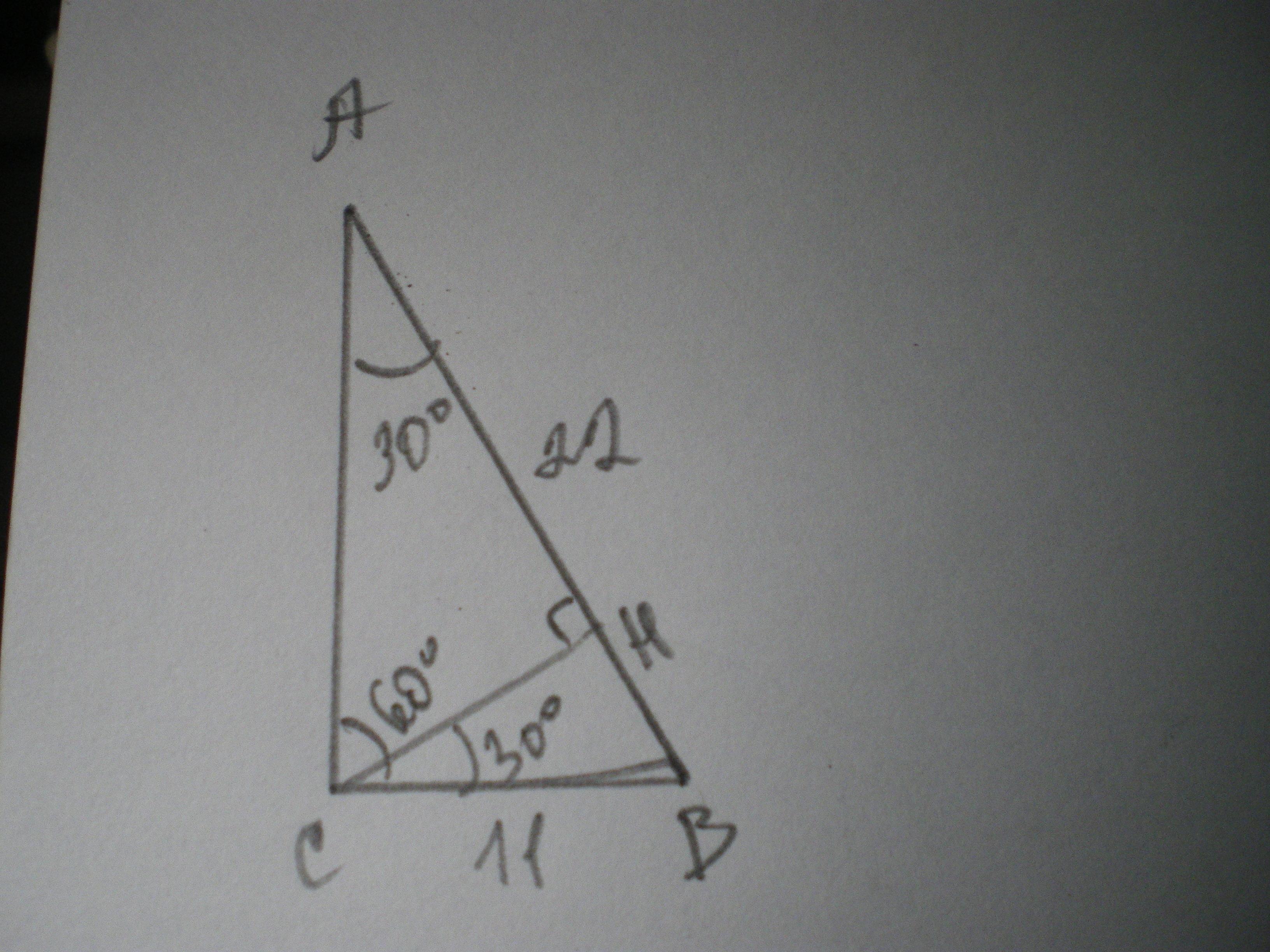 В прямоугольном треугольнике ABC c = 90° , BC = 11 см, AB = 22 см.