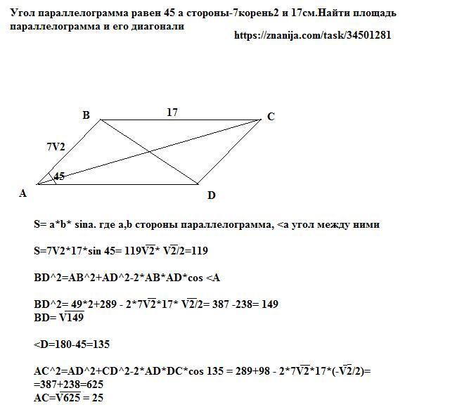 Угол параллелограмма равен 45 а стороны-7корень2 и 17см.Найти площадь параллелограмма и его диагонали