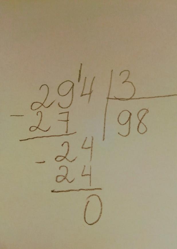 в тетради напиши столбиком которое написала.294-на3 нам хватит 29 даём по 9 получается 24 теперь по 8 получается 24 будет 0