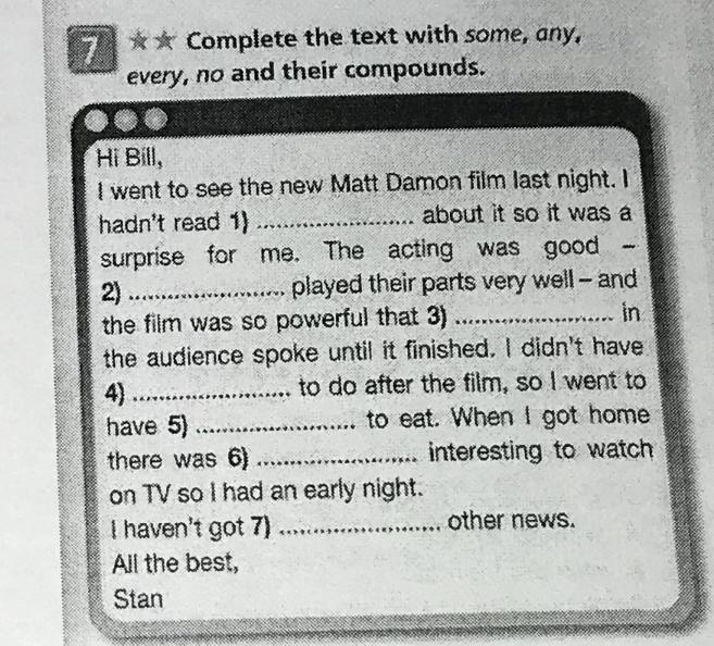 1)Anything 2)everyone 3)nobody 4)anything 5)something 6)nothing 7)any.