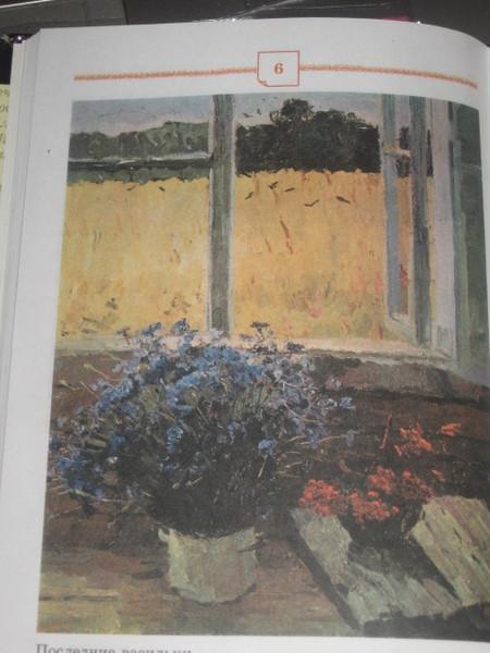 Букет из синих цветов огромный. Он смотрит сквозь распахнутое окно прямо на поле, с которого его принесли, и прощается с ним. Рядом с васильками, справа стоит небольшой глиняный горшочек с красными цветами. Скорее всего это маки с того же пшеничного поля. Кто-то нарвал их и принес в дом, зная, что скоро начнется жатва. Эти последние цветы символизируют уходящее лето. Жиденький букет из нескольких маков еще больше подчеркивает значимость васильков на картине, то, насколько букет из них большой и густой.