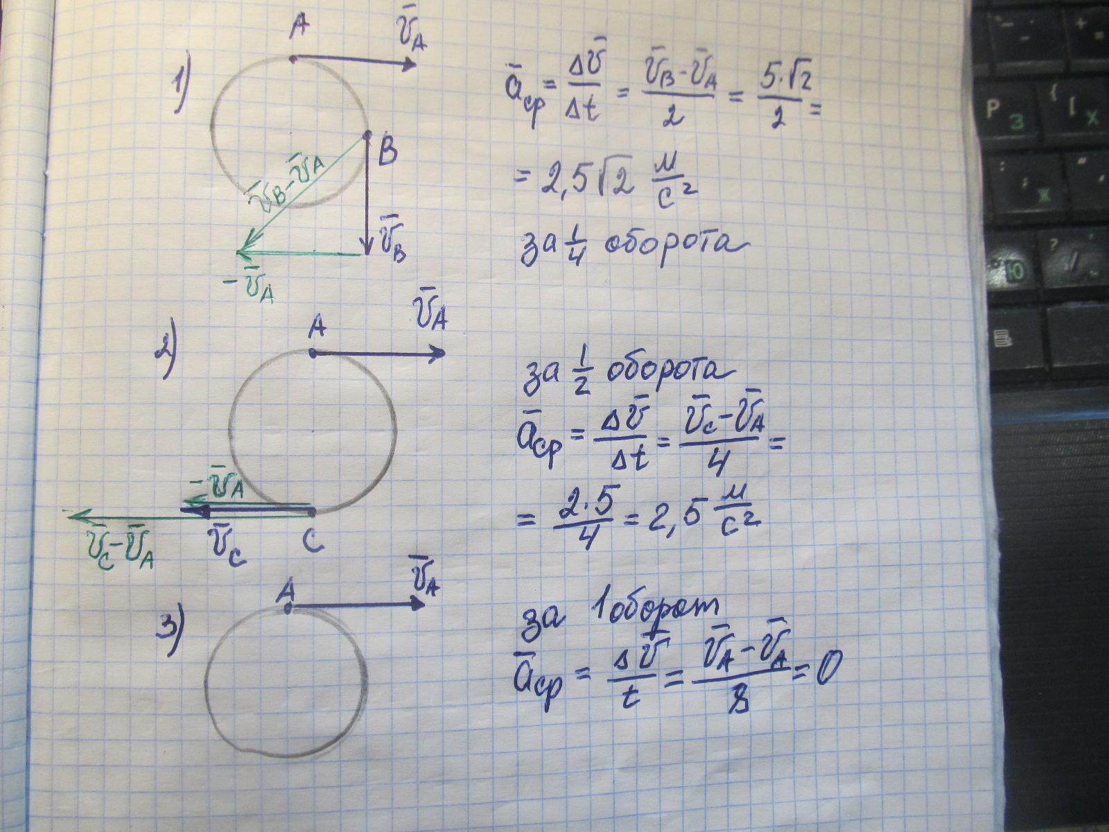 Материальная точка движется равномерно по окружности со скоростью 5 м/c. За 2 с она проходит четверть окружности. Oпределите среднее ускорение точки. Oпределите также среднее ускорение точки, когда она сделает половину оборота и целый оборот.