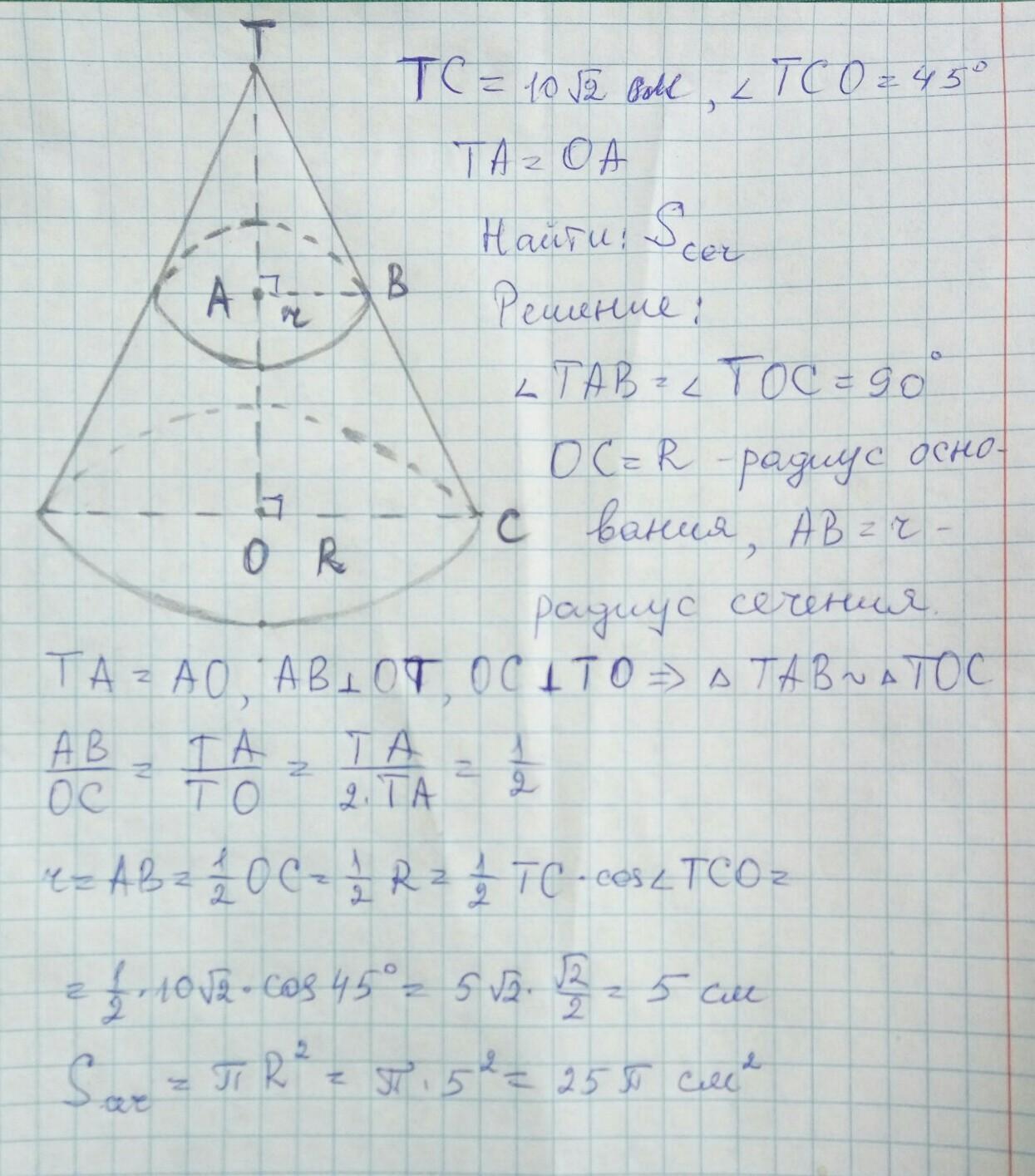 Образующая конуса, равна 10√2 см, наклонена к плоскости его основания под углом 45∘. Найдите площадь сечения, проведенного через середину высоты конуса параллельно его основе. Ответ запишите в виде Sпер./π.