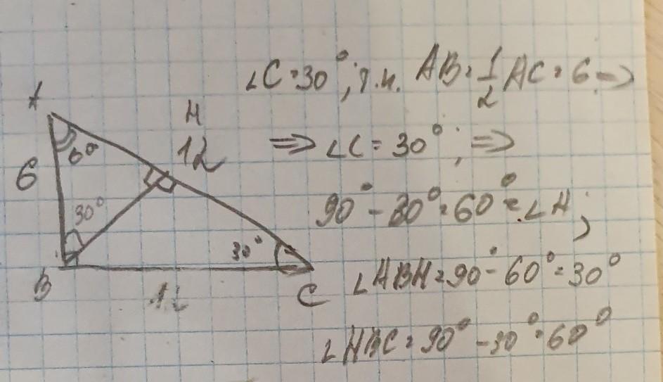 В прямоугольном треугольнике ABC угол B= 90 градусов, AB=6см, AC= 12см. Найдете углы которые образует высота BH с катетами треугольника. Можно точное решение!!!! Дам 50 баллов❤️❤️❤️❤️