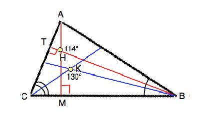 Треугольник ABC остроугольный. Высоты A и B дает пересечение H, образуя угол AHB = 114. Пересечение биссектрис BC образует K, образуя угол BKC= 130. Найдите градусы всех углов