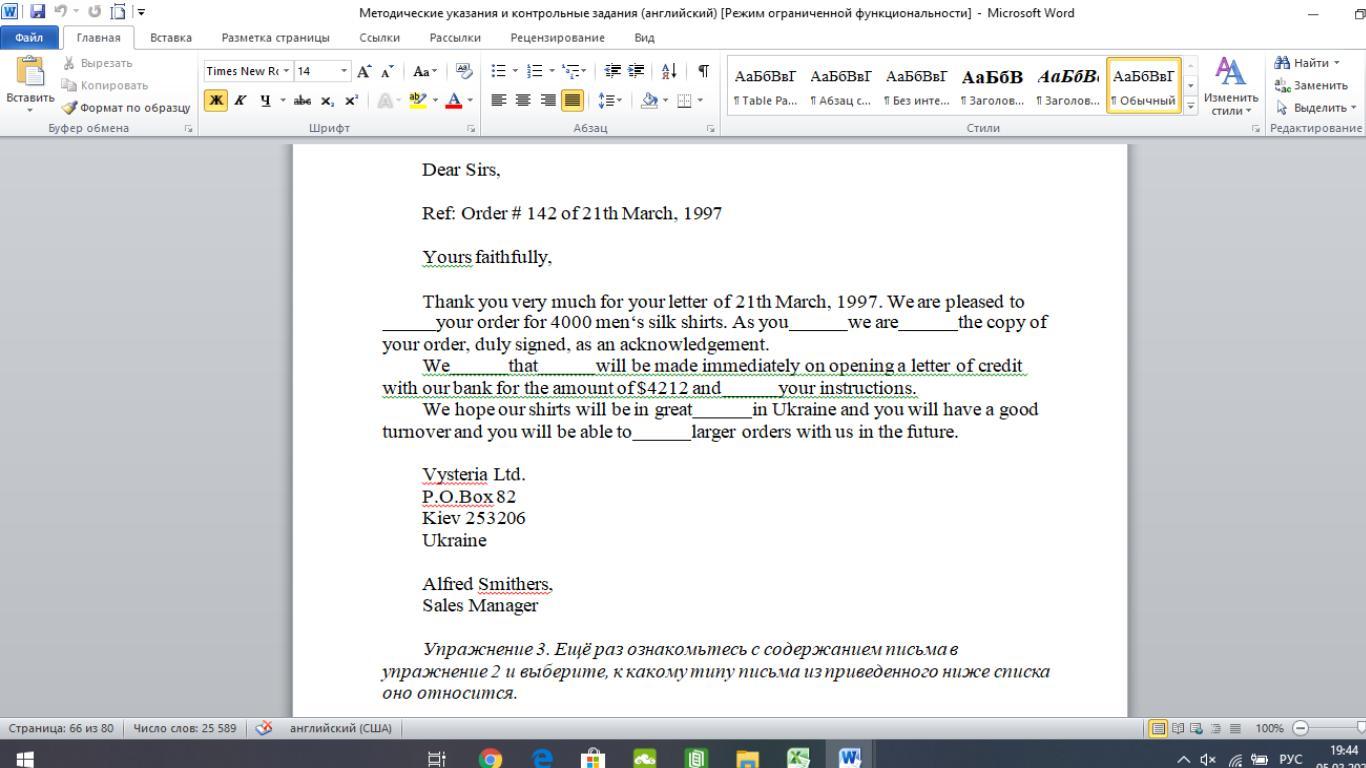Расставьте части письма в правильном порядке. Вместо пропусков в основной части письма вставьте правильное слово из рамочки. Будьте внимательны: вам понадобятся не все предложенные слова. СЛОВА: Acknowledge enclosing offer confirm requested in accordance with delivery place demand writing