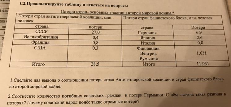 2. - Соотношение СССР и Германии 4 к 1. Такая разница в соотношении, в связи с начальным провалом войны СССР и большой гибелью мирного населения (около 18 миллионов). Советский народ понёс такие потери в связи с политика Третьего рейха в отношении советских граждан проводилась в соответствии с планами Бакке и Ост, подразумевавшими частичное уничтожение гражданского населения (геноцидом) славянской, а также еврейской части советского народа.