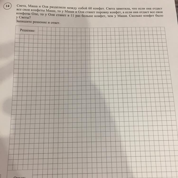 Заметим, что у Оли столько же конфет, сколько у Маши и Светы вместе. Значит, у неё половина общего числа конфет, то есть 30 конфет. У Оли и Светы вместе конфет в 11 раз больше, чем у Маши. Поэтому у Маши общего числа конфет, то есть 5 конфет.