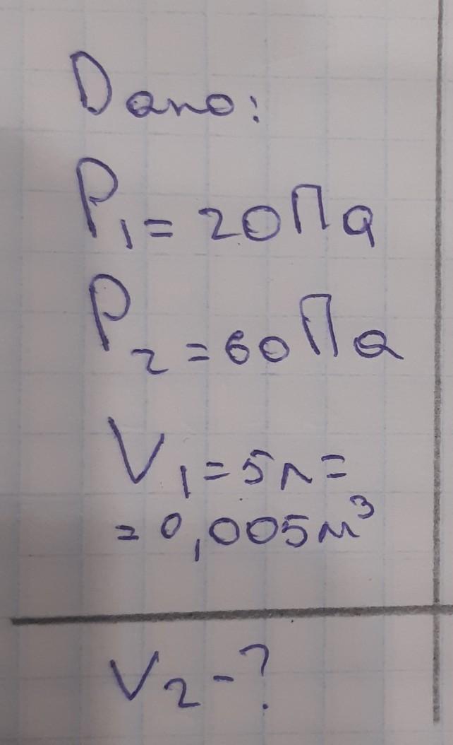 P1/P2 = V1/V2 = 20/60 = 5 л / x ----> x=15 литров = 0,015 метров в кубе