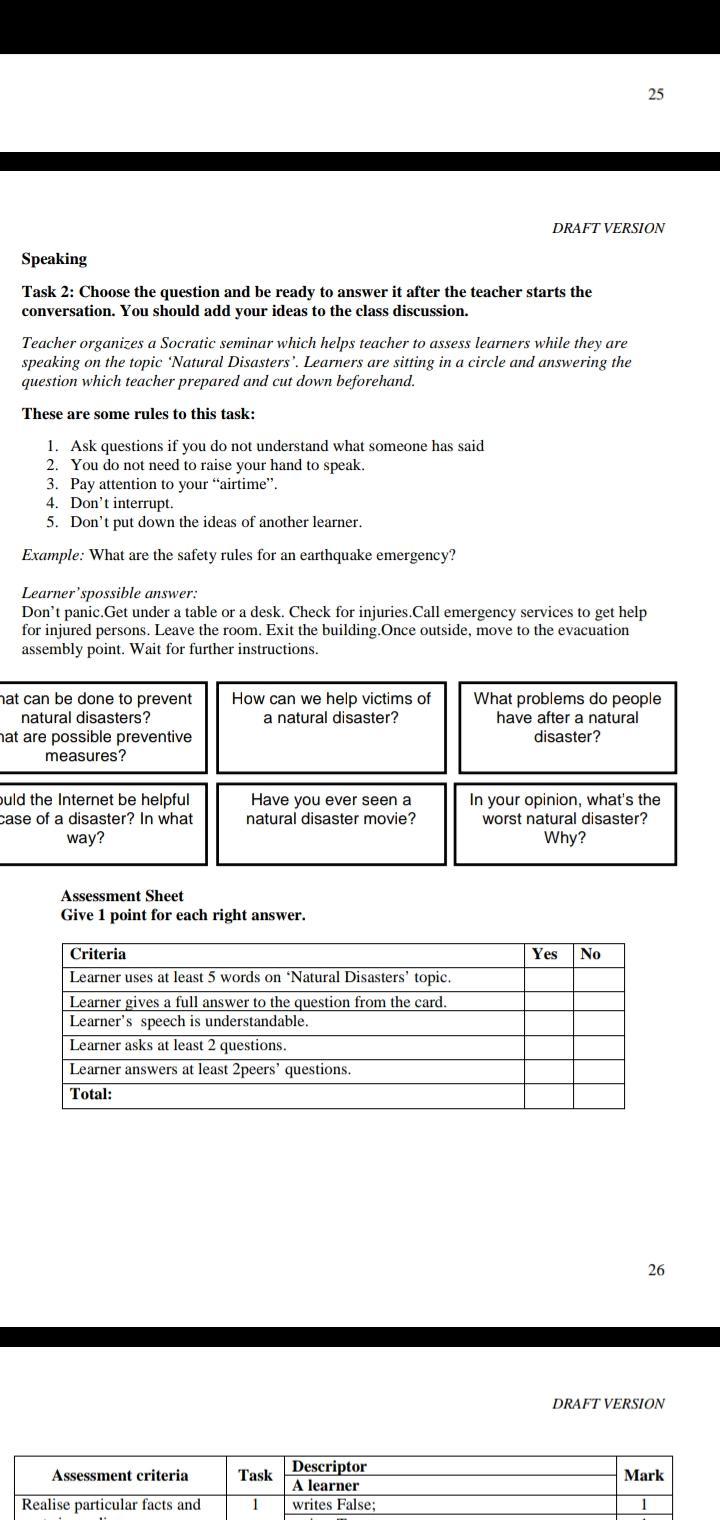 2: Выберите вопрос и будьте готовы ответить на него после того, как учитель начнет разговор. Вы должны добавить свои идеи для обсуждения в классе. Учитель организует Сокротический семинар, который помогает учителю оценивать учащихся во время их выступления на тему «Стихийные бедствия». Учащиеся сидят в кружке и отвечают на вопрос, который учитель подготовил и урезал заранее. Вот некоторые правила для этой задачи: 1. Задавайте вопросы, если вы не понимаете, что сказал сомконе. 2. Вам не нужно поднимать руку, чтобы говорить. 3. Обратите внимание на ваше «эфирное время». 4. Не включайте. 5. Не подавляйте идеи другого ученика. Пример: каковы правила безопасности при возникновении землетрясения? Возможный ответ ученика: не паникуйте. Садитесь под стол или стол. Проверьте наличие травм. Позвоните в экстренные службы, чтобы получить помощь для пострадавших. Покинуть комнату. Выйти из buikling. Выйдя на улицу, переместитесь в пункт сбора эвакуации, дождитесь дальнейших инструкций.
