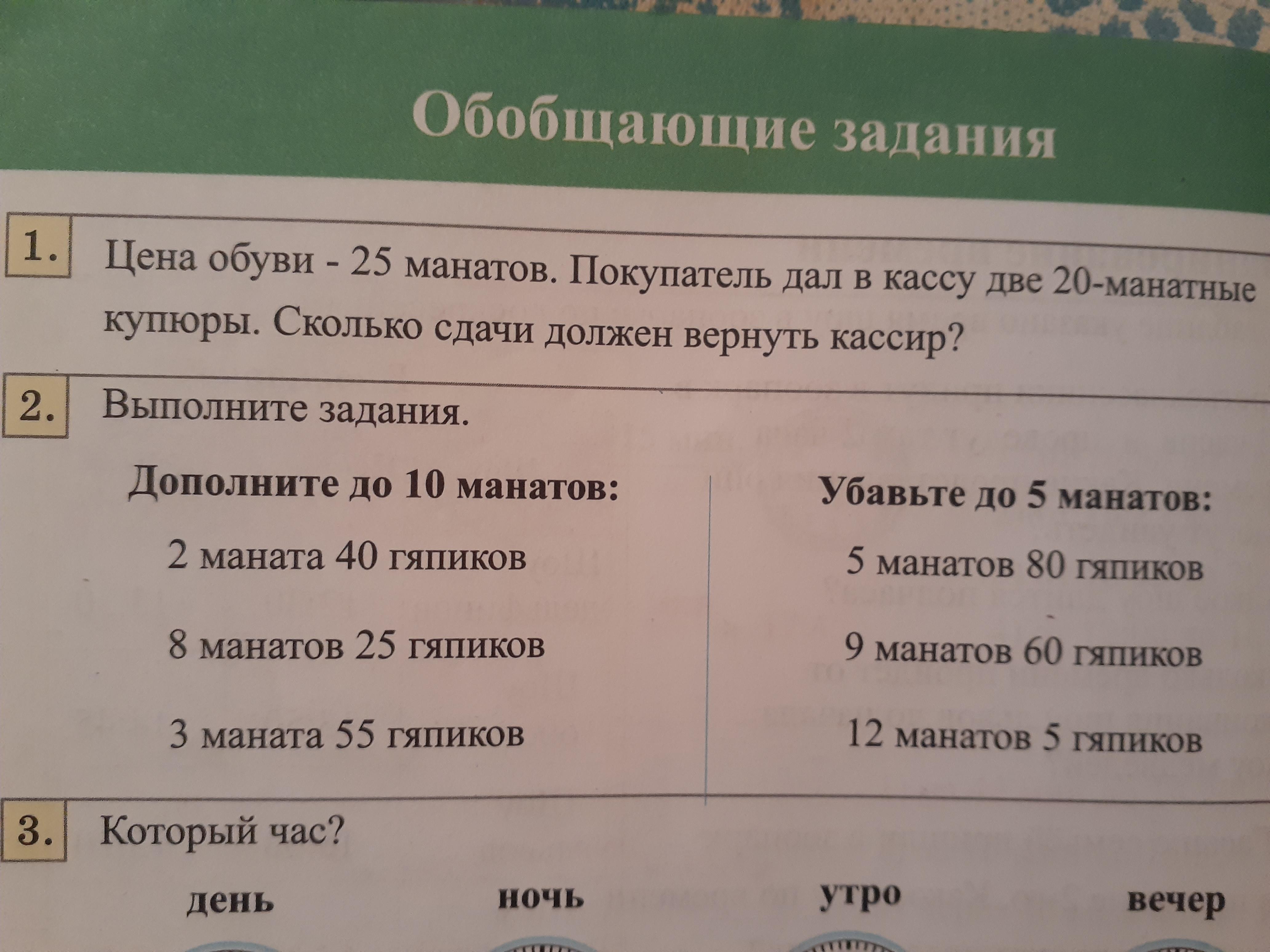 10 манат - 2 м. 40 г.= 7 манат 60 гяп.