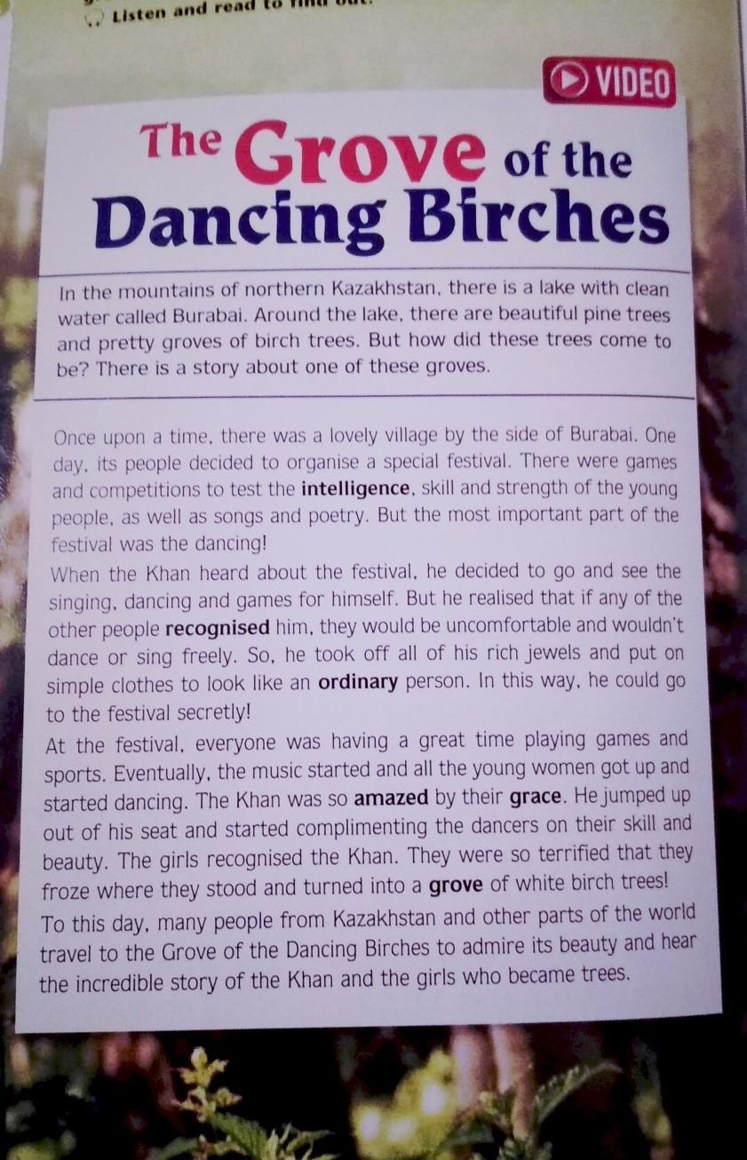 Когда-то на берегу Бурабаи была прекрасная деревня. Однажды его жители решили организовать специальный фестиваль. Были игры и конкурсы, чтобы проверить интеллект, мастерство и силу молодых людей, а также песни и поэзию. Но самой важной частью фестиваля были танцы! Когда Хан узнал о фестивале. он решил пойти и посмотреть пение, танцы и игры для себя. Но он понял, что если кто-то из других узнает его, им будет неудобно, и они не будут свободно танцевать или петь. Итак, он снял все свои богатые драгоценности и надел простую одежду, чтобы выглядеть как обычный человек. Таким образом, он мог бы пойти на фестиваль тайно! На фестивале все прекрасно проводили время за играми и спортом. В конце концов музыка началась, и все молодые женщины встали и начали танцевать. Хан был так поражен их милостью. Он вскочил со своего места и начал хвалить танцоров за их мастерство и красоту. Девочки узнали хана. Они были так напуганы, что застыли на месте и превратились в рощу белых берез! По сей день многие люди из Казахстана и других частей света едут в Рощу Танцующих Берез, чтобы полюбоваться ее красотой и услышать невероятную историю о Хане и девушках, которые стали деревьями.