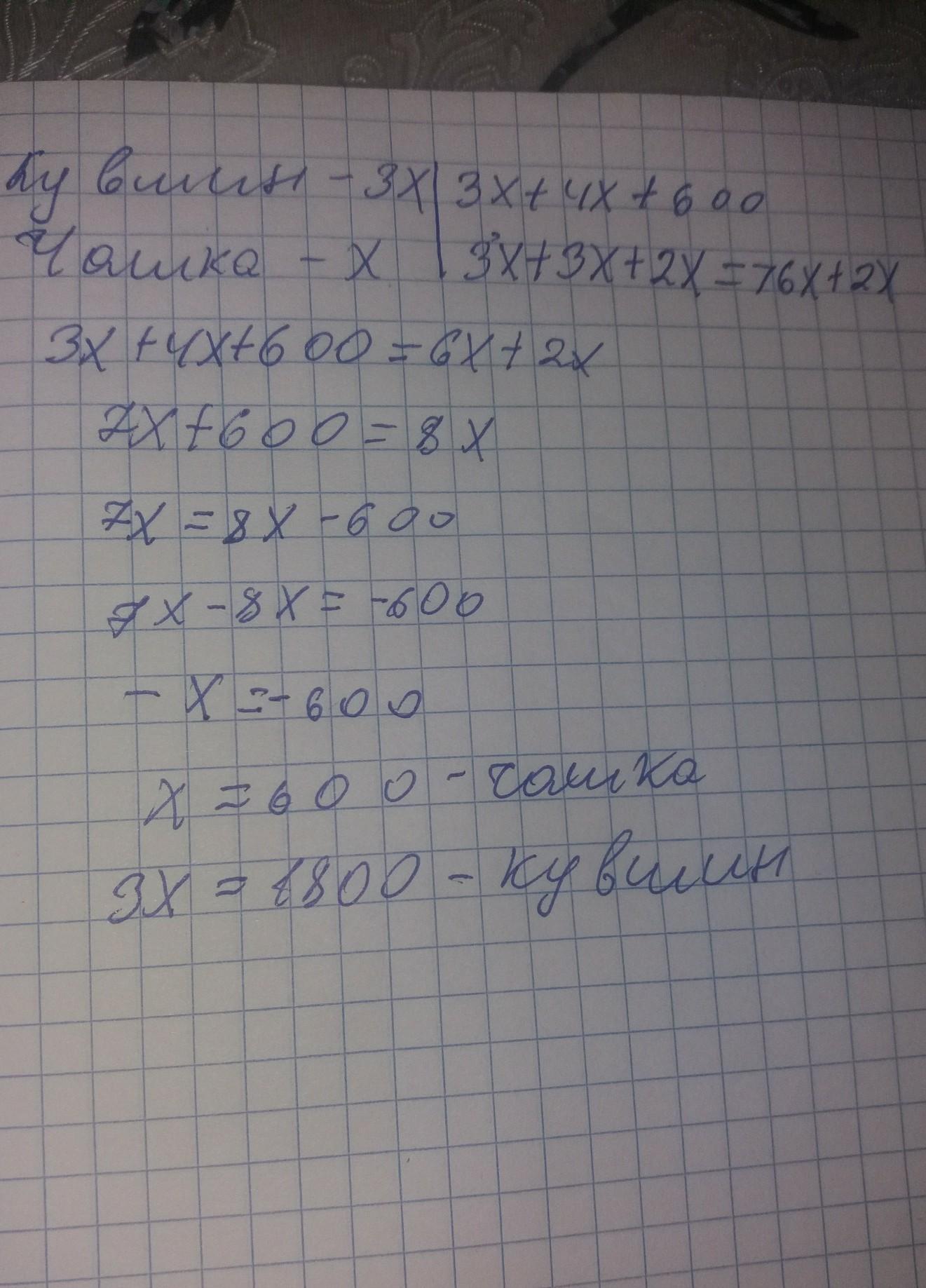кувшин стоит в три раза дороже чашки. первый покупатель купил кувшин и 4 чашки, а второй купил два кувшина и две чашки заплатив на 600 рублей больше. Сколько стоит кувшин?