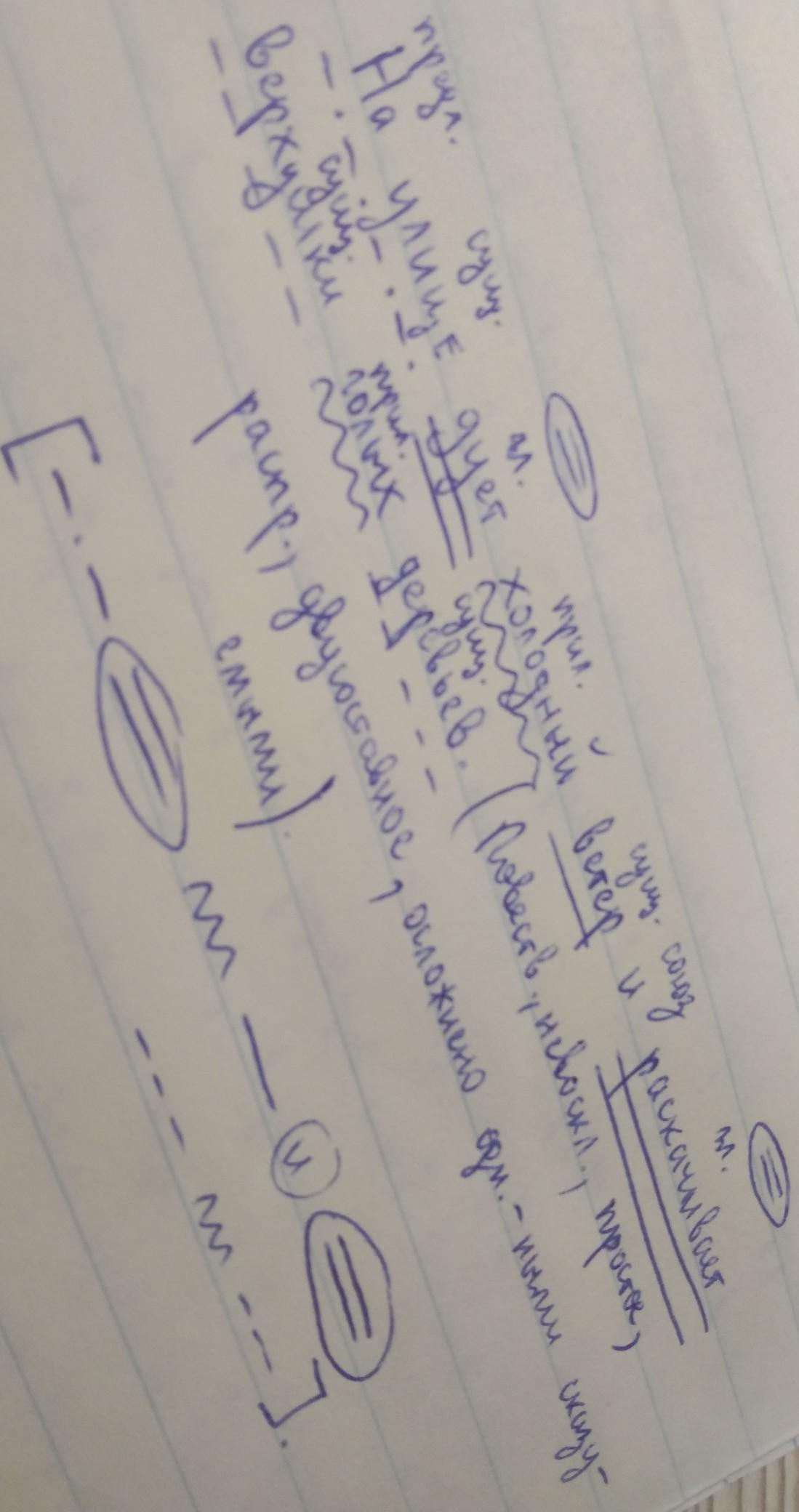 На улице дует холодный ветер и раскачивает верхушки голых деревьев. Разбор предложения,