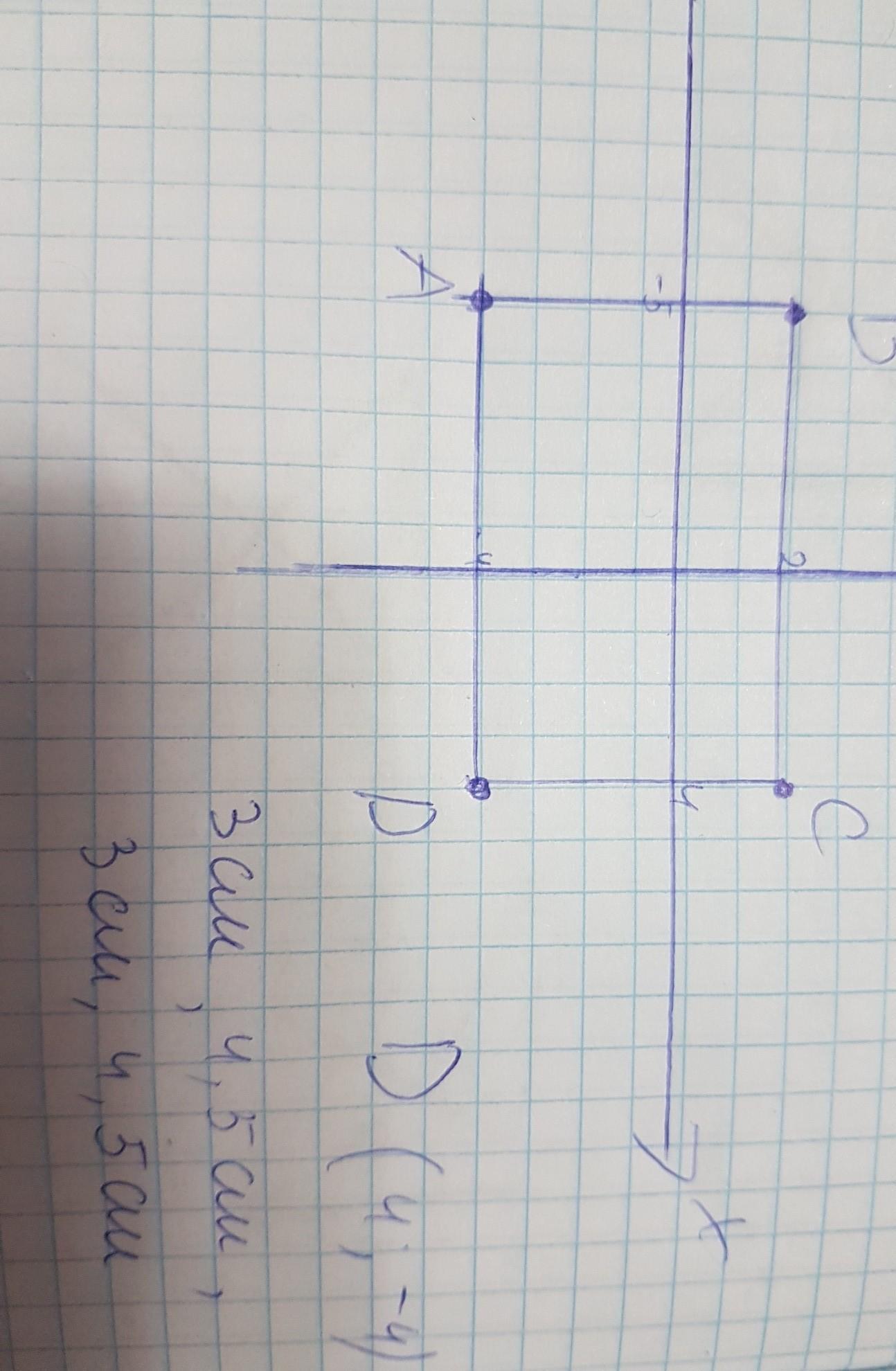используя координаты трёх вершин А ( -5; -4), В (-5; 2), и С ( 4; 2) прямоугольника АВСD а) начертите этот прямоугольник б) опредилете кординаты точки D в) опредилите длины сторон прямоугольника ( в единичных отрезках).