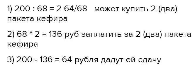 пакет кефира стоит 68 руб. у кати есть 200 руб. какое наибольшее количество пакетов кефира она может купить сколько денег останется у кати