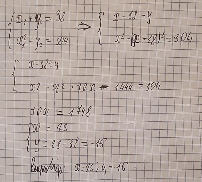 решите задачу с помощью составления уравнения Сумма двух чисел равна 38, а разность их квадратов 304 Найдите эти числа
