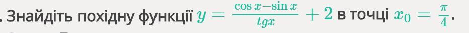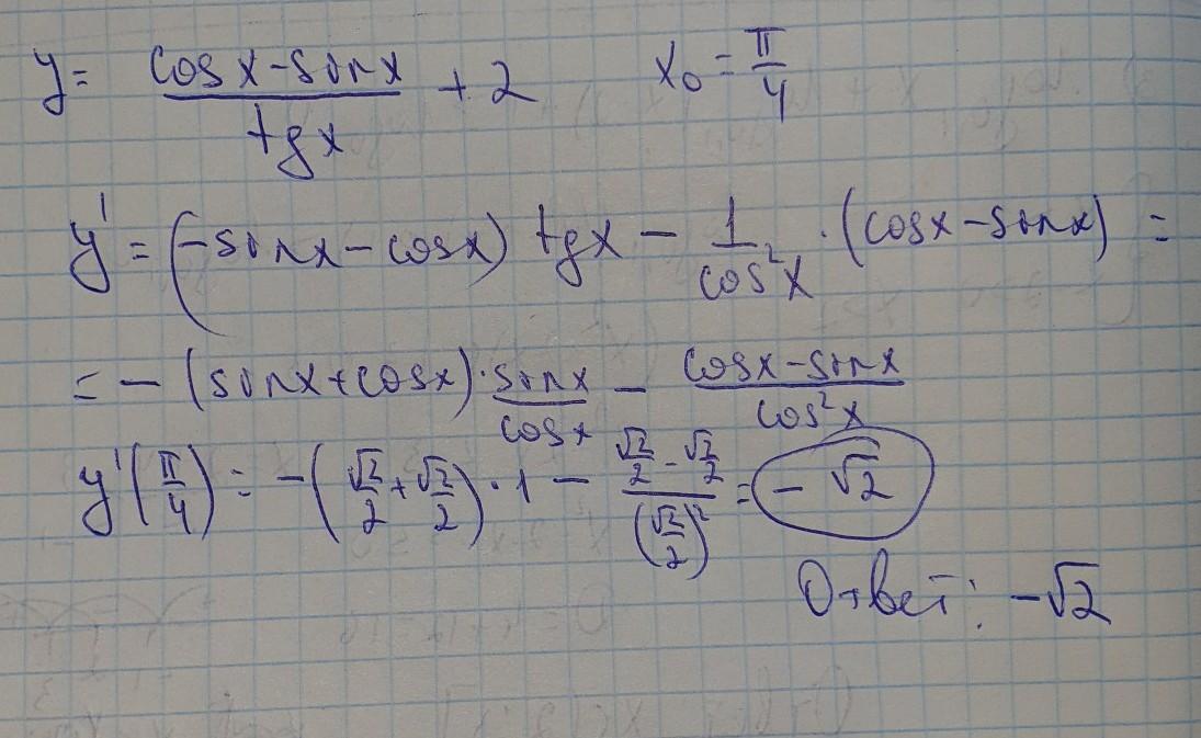 Помогите!!! Найдите производную функции y = ((cos x - sin x )/t g x)) + 2 в точке x 0 = π/ 4 .