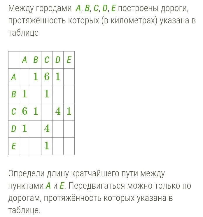 Определи длину кратчайшего пути между пунктами A и E. Передвигаться можно только по дорогам, протяжённость которых указана в таблице.