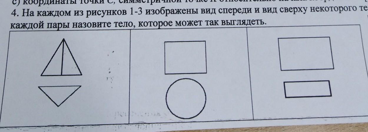 на первой картине верхняя картинка это вид с боку пирамида а снизу это вид сверху то есть треугольник на второй картинке вид спереди это квадрат (или прямоугольник) а сверху цилиндр третия картина это вид с боку паралепипед а снизу прямоугольник