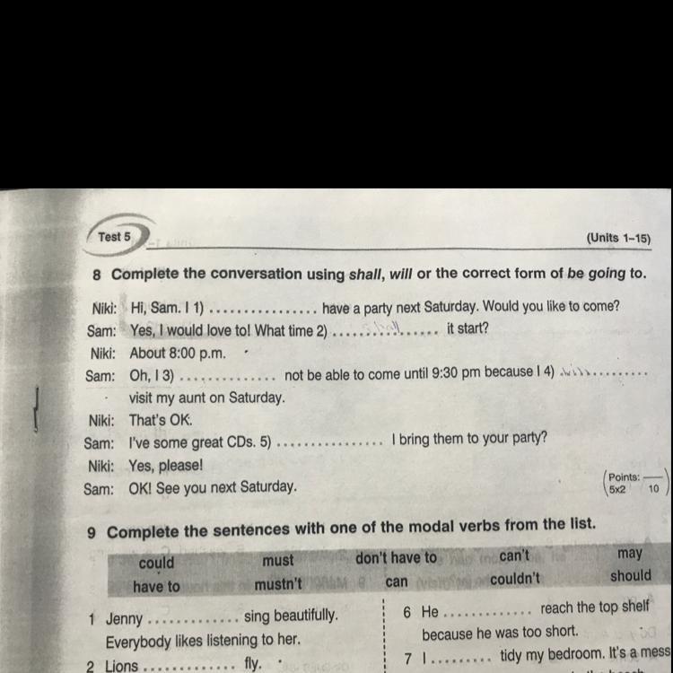 Sam: Oh, 13) .............. not be able to come until 9:30 pm because I 4) wil..