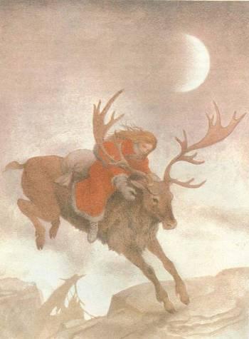 На ней только красненькая шубка, а шапочка и варежки потеряны в сумасшедшей скачке. Но она не замечает пропажи. Её согревает надежда на возвращение Кая. Быстроногий олень несет её в страну льда и тьмы, в страну, где нет ни цветов, ни красок, а живет только холод. И Снежная королева, укравшая у неё Кая.