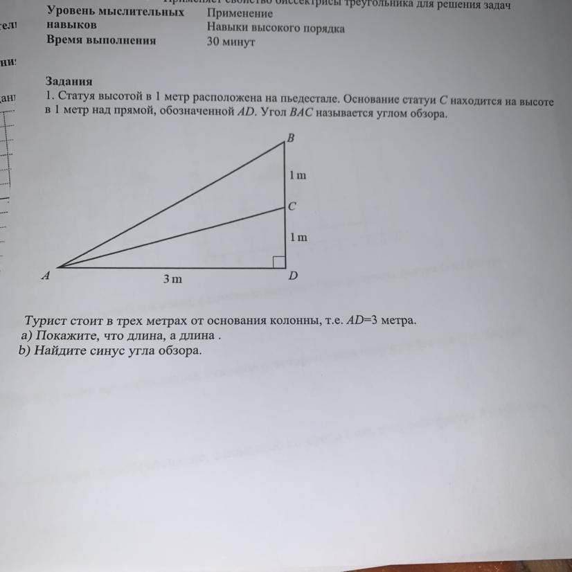 Статуя высотой в 1 метр расположена на пъедестале. Основание статуи С находится на высоте в 1 метр над прямой, обозначенной AD.Угол ВАС называется углом обзора.