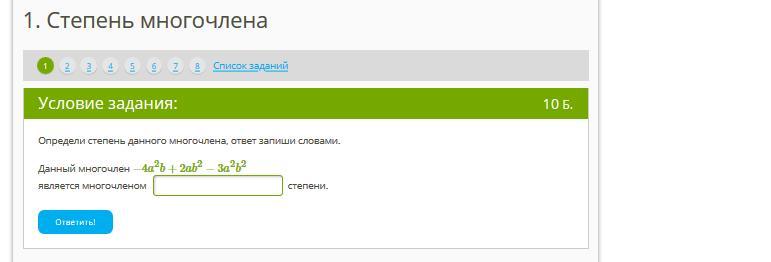 Так как одночлен имеет 4-ю степень (сумма показателей переменных равна 2+2=4 ), а остальные одночлены имеют меньшую степень, третью, то заданный многочлен четвёртой степени.