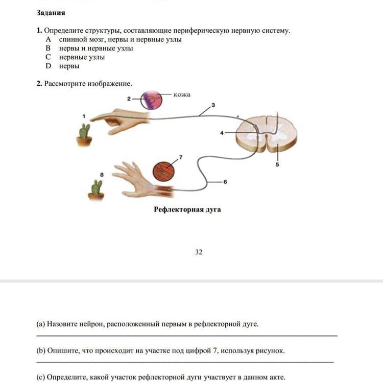 (в)прикосновение к кактксу создаёт болевое ощущение и вызывает одёргивание руки.Это происходит благодаря сгибательному рефлексу.При этом болевые сигналы попадают в спиной мозг и передают выставочным нейронам а они возбуждают исполнительные нейроны посылающие команду к мышцам руки.