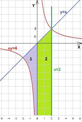 1) x∈[-2;0) , снизу область ограничена гиперболой y = 4/x, сверху прямой y=x (на рисунке залита фиолетовым цветом )