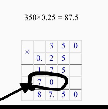 т.к. 350 оканчивается на 0, то мы можем его пока не учитывать и в конце к результату просто приписываем 0, поэтому и 0,25 мы написали сдвинув влево на 1 клетку