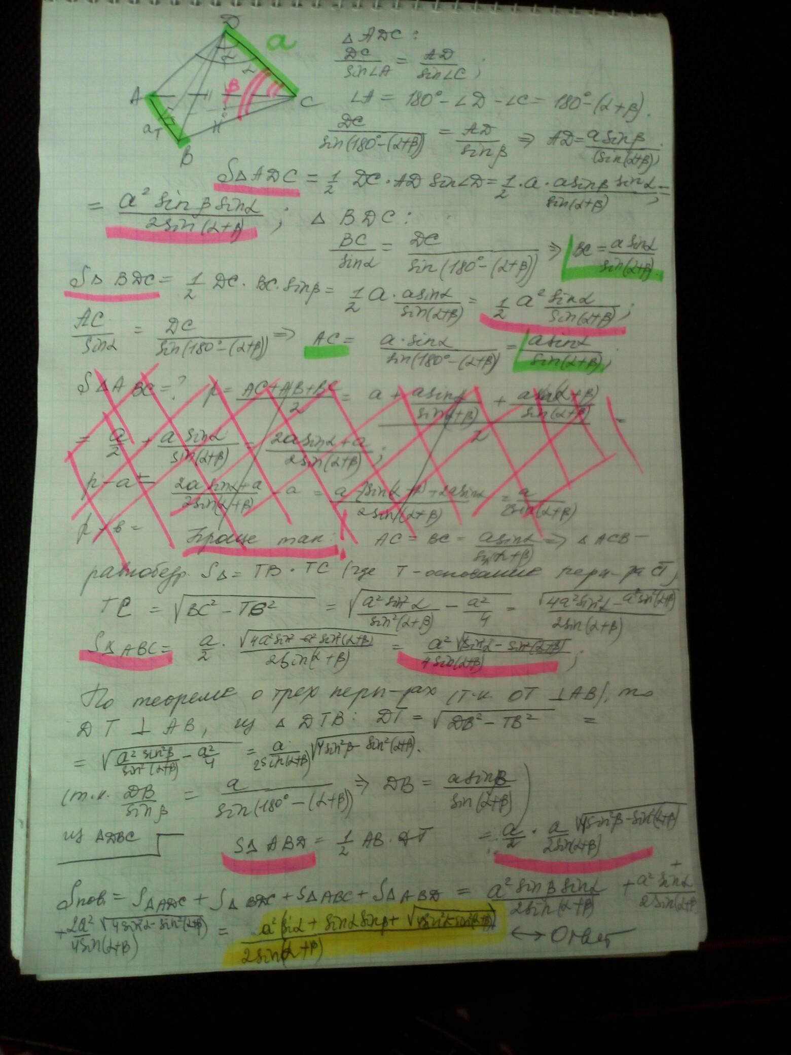 В тетраэдре ABCD угол ADC= углу BDC= альфа, угол ACD= углу BCD= бэтта, AB = CD= a. Как найти площадь его поверхности, т. е. сумму площадей его граней?